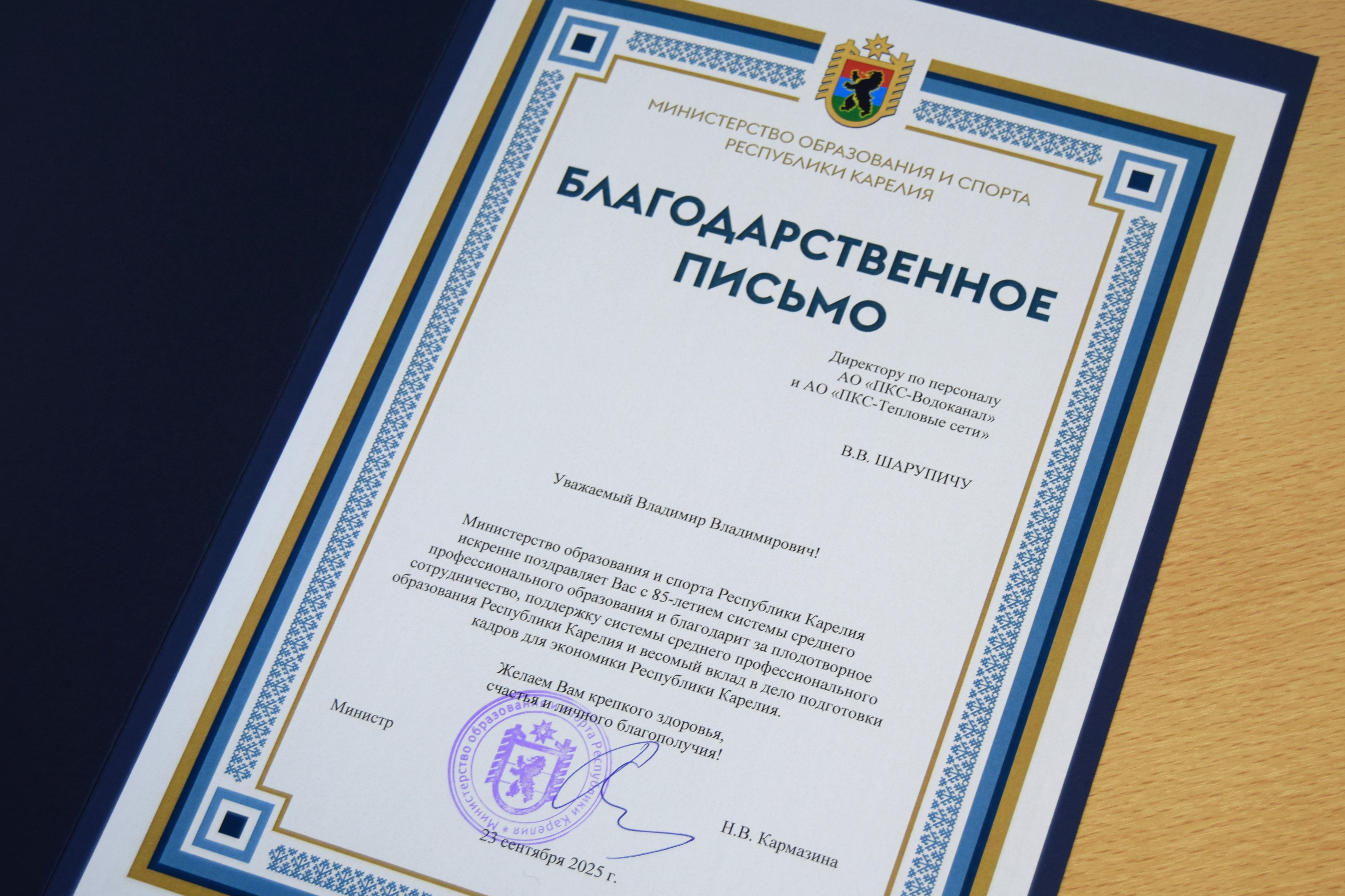Поддержка среднего профессионального образования: «РКС - Петрозаводск» отмечены благодарностью