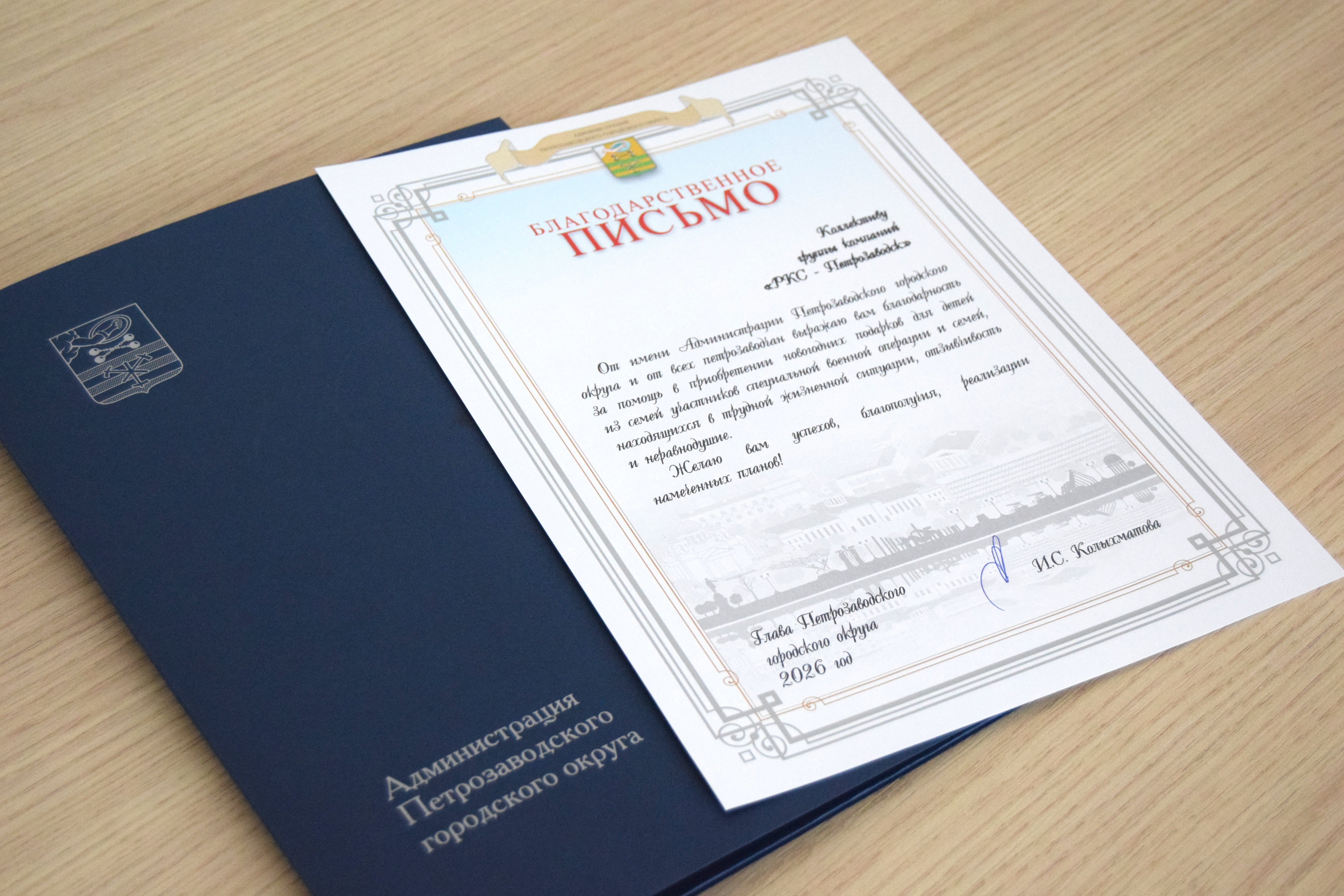 Благодарственное письмо от Главы Петрозаводского городского округа Инны Колыхматовой получил директор по стратегическим коммуникациям «РКС – Петрозаводск» Олег Гуменников.