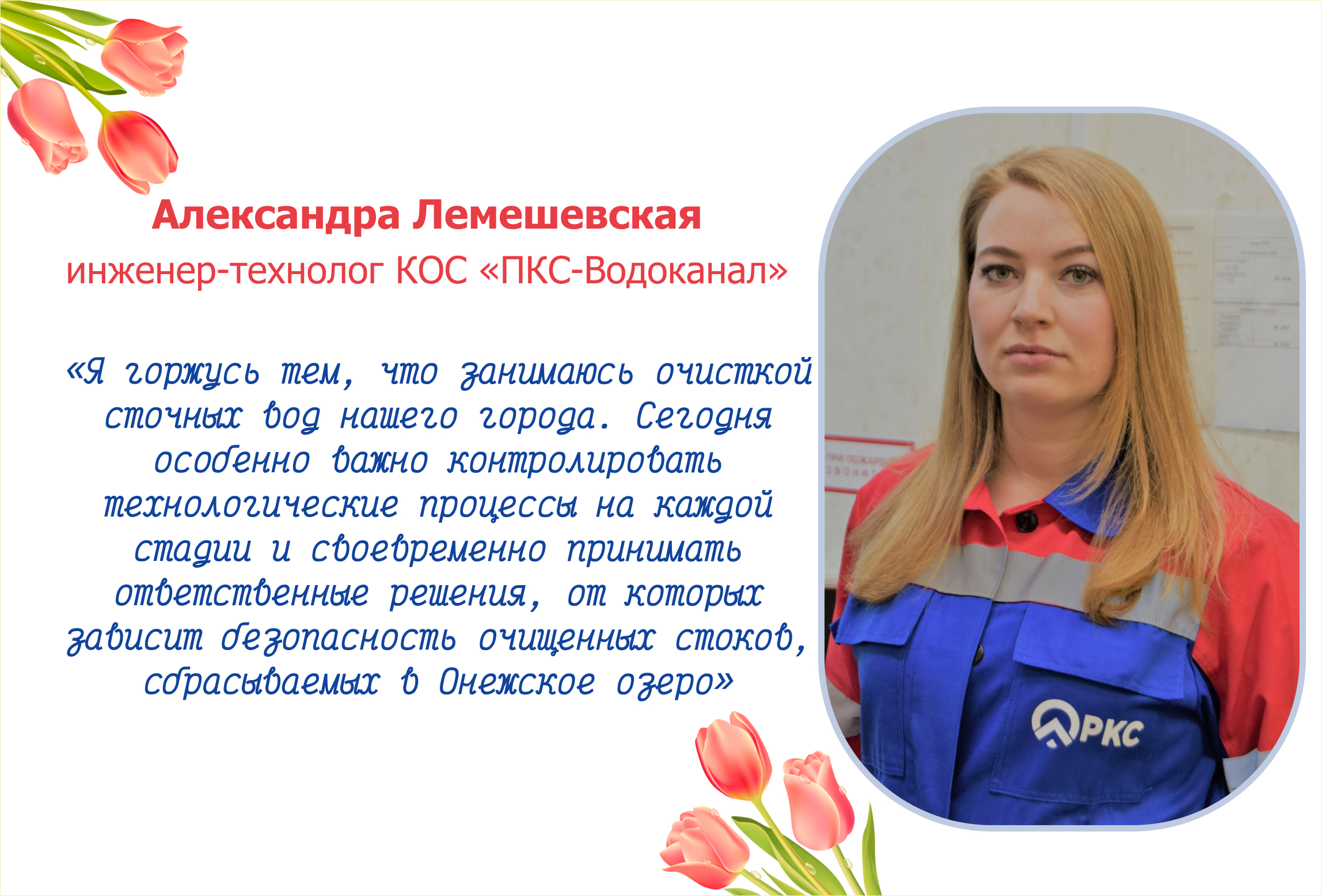 Инженер-технолог Александрa Лемешевскaя точно подметила то, что объединяет всех наших сотрудниц: их ежедневный труд формирует качество жизни горожан и экологическое благополучие города. Для нашей компании это не просто слова, а принцип работы!